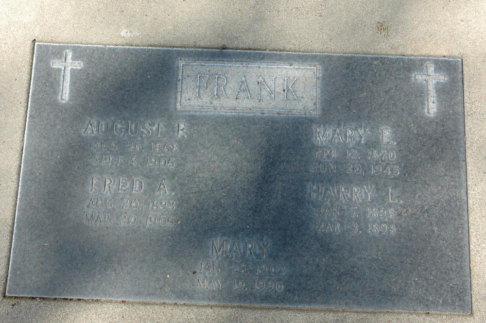 Names August F. Frank, Fred A. Frank, Harry L. Frank, Mary Frank, and Mary E. Frank