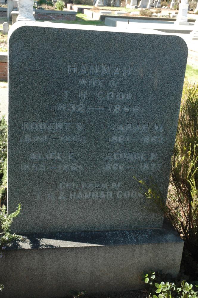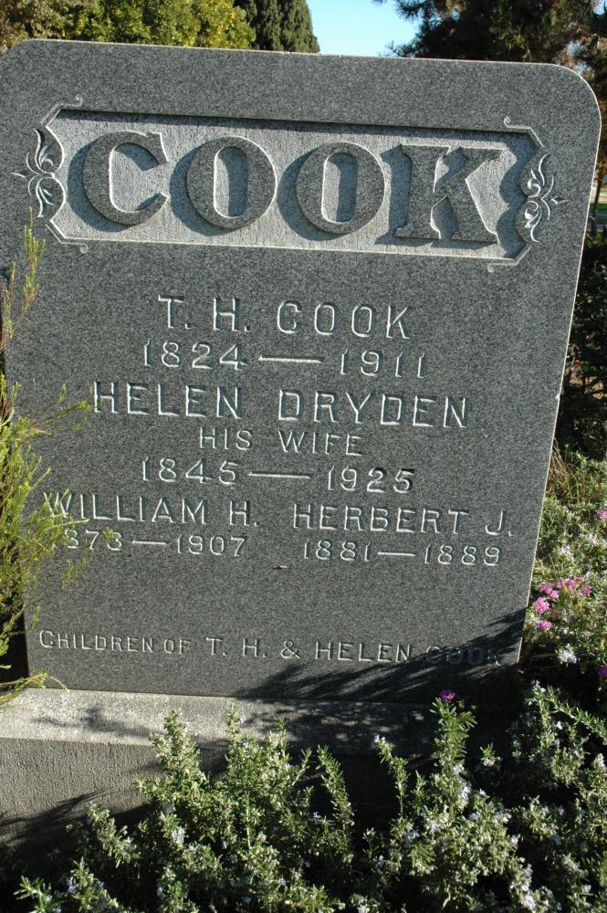 | Names | Alice E. Cook, George N. Cook, Hannah Cook, Helen Dryden Cook, Herbert J. Cook, Robert S. Cook, Sarah M. Cook, T. H. Cook, and William H. Cook |