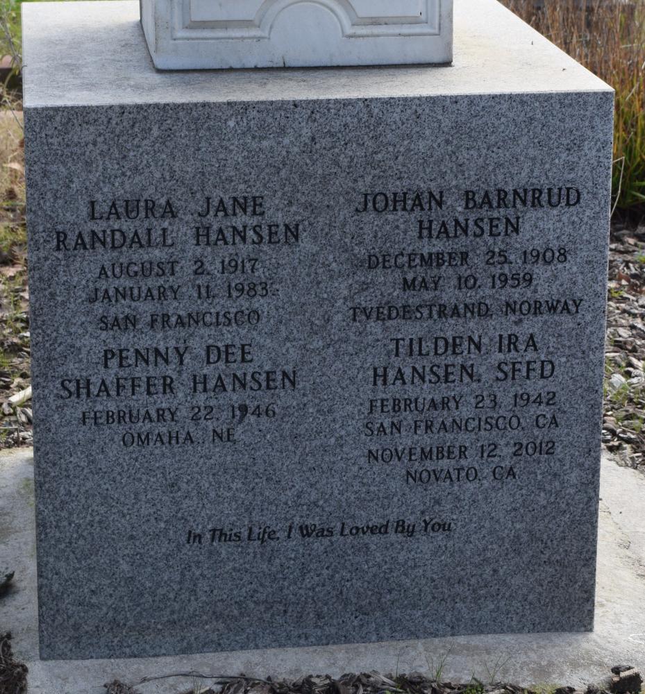 | Names | Johan Barnrud Hansen, Laura Jane (Randall) Hansen, Penny Dee (Shaffer) Hansen, and Tilden Ira Hansen SFFD |